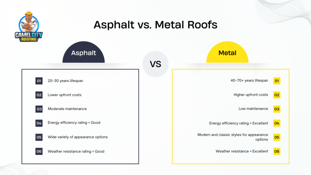 Asphalt roofs typically last 20 to 30 years, while metal roofs can last 40 to 70 years or longer.